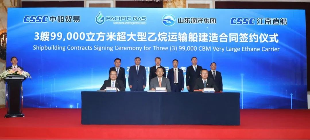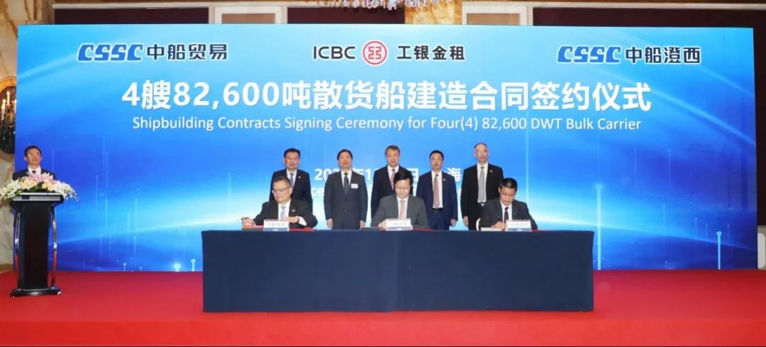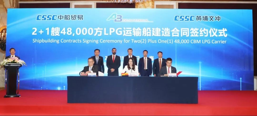 簽約儀式上,外高橋造船、中船貿(mào)易與Seaspan、現(xiàn)代Glovis簽署了6+4艘10800車(chē)LNG雙燃料PCTC船項(xiàng)目;廣船國(guó)際、中船貿(mào)易與HMM、現(xiàn)代Glovis簽署了6+4艘10800車(chē)LNG雙燃料PCTC船項(xiàng)目;北海造船、中船貿(mào)易與北銀金租、山東海運(yùn)簽署了4艘325000噸超?型甲醇雙燃料礦砂船項(xiàng)目;江南造船、中船貿(mào)易與太平洋氣體簽署了3艘99000方VLEC船項(xiàng)目;黃埔文沖、中船貿(mào)易與Benelux公司簽署了2+1艘48000方LPG船項(xiàng)目;中船澄西、中船貿(mào)易與工銀金租簽署了4艘82600噸散貨船項(xiàng)目;大連造船與七二五所青島雙瑞簽署了15000TEU集裝箱船甲醇供應(yīng)系統(tǒng)項(xiàng)目。