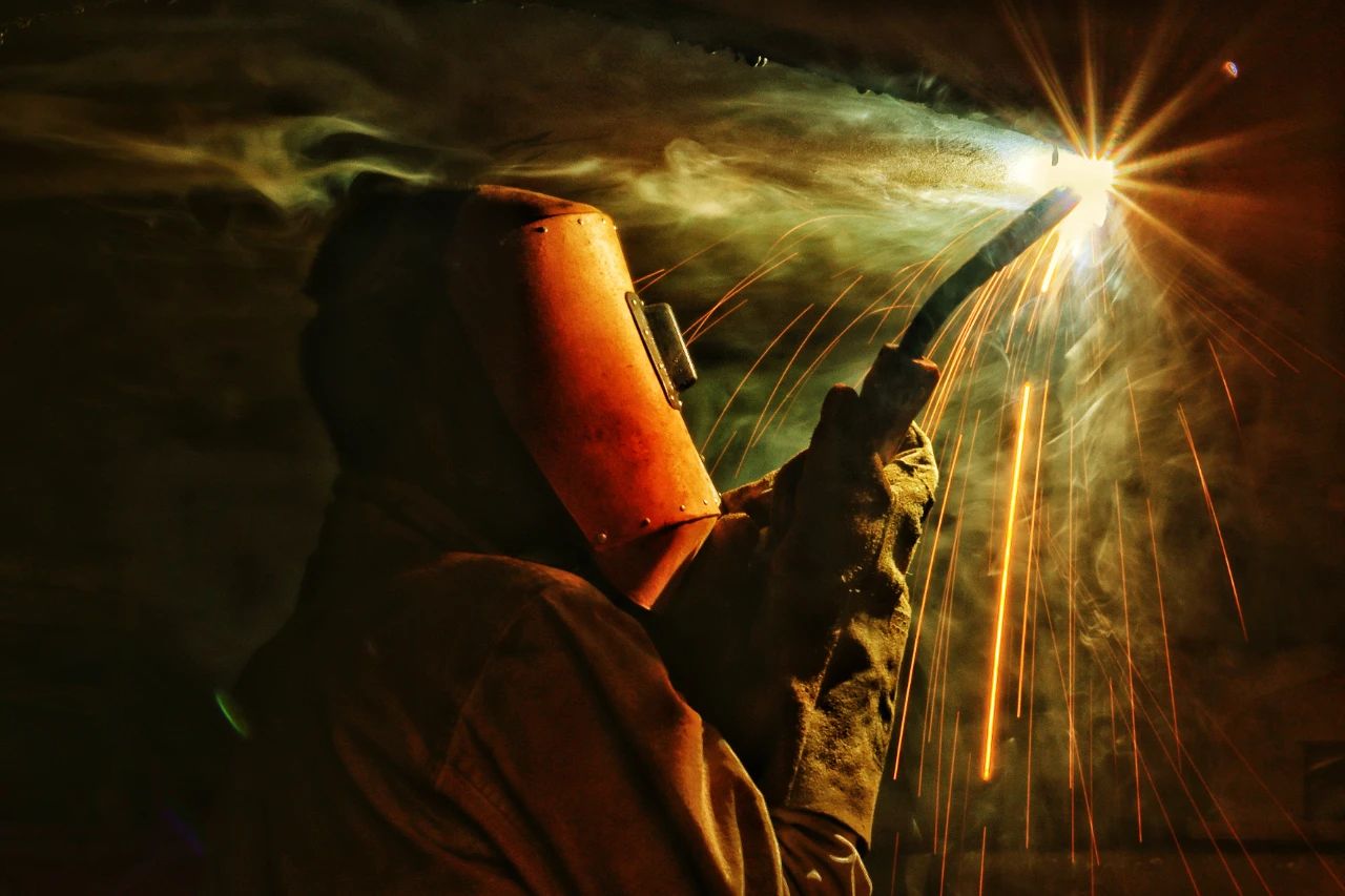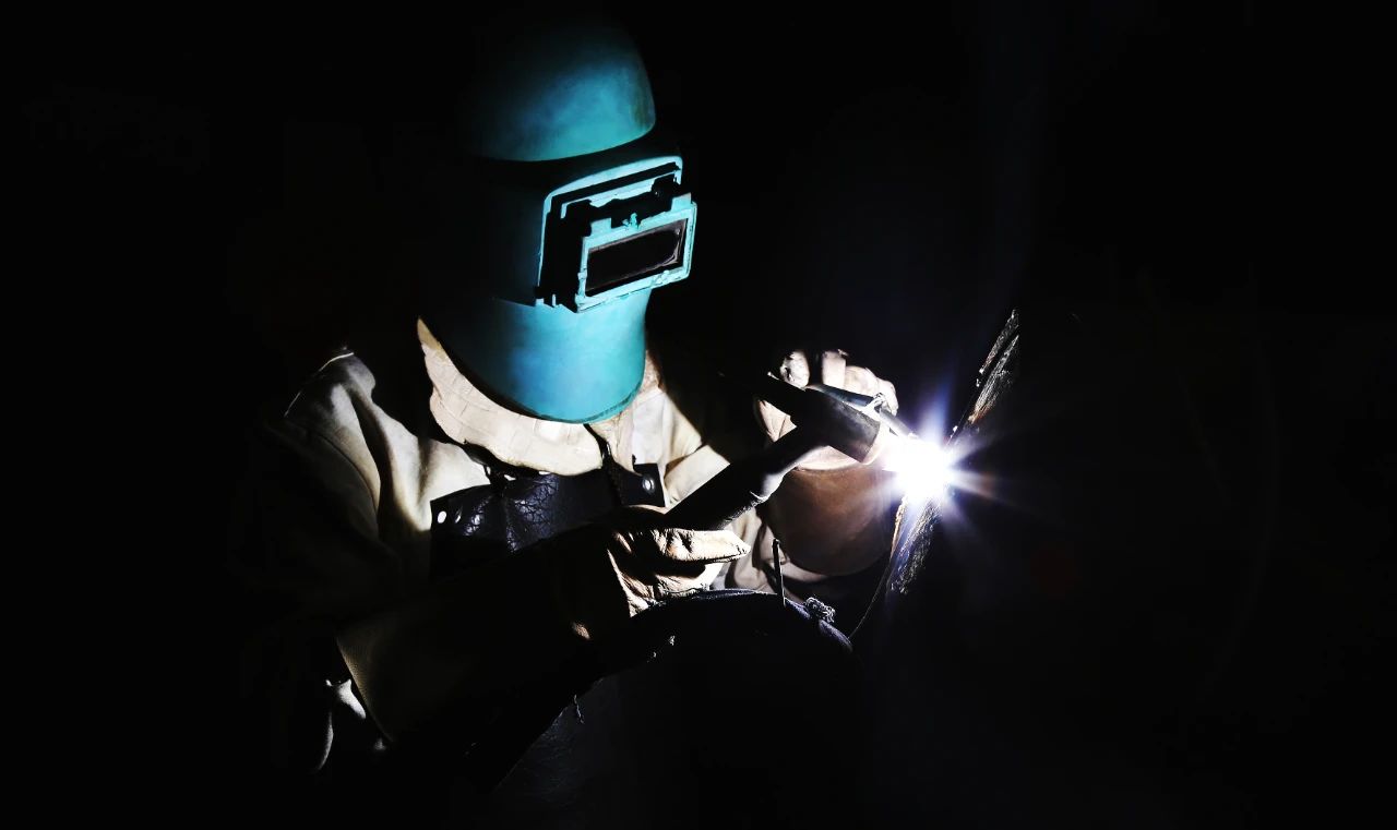 一位“全副武裝”正在進(jìn)行焊接作業(yè)的焊工,焊花飛舞在狹小的工間里,折射出如彩云般的景象,猶如巨人正在“補(bǔ)天”。
