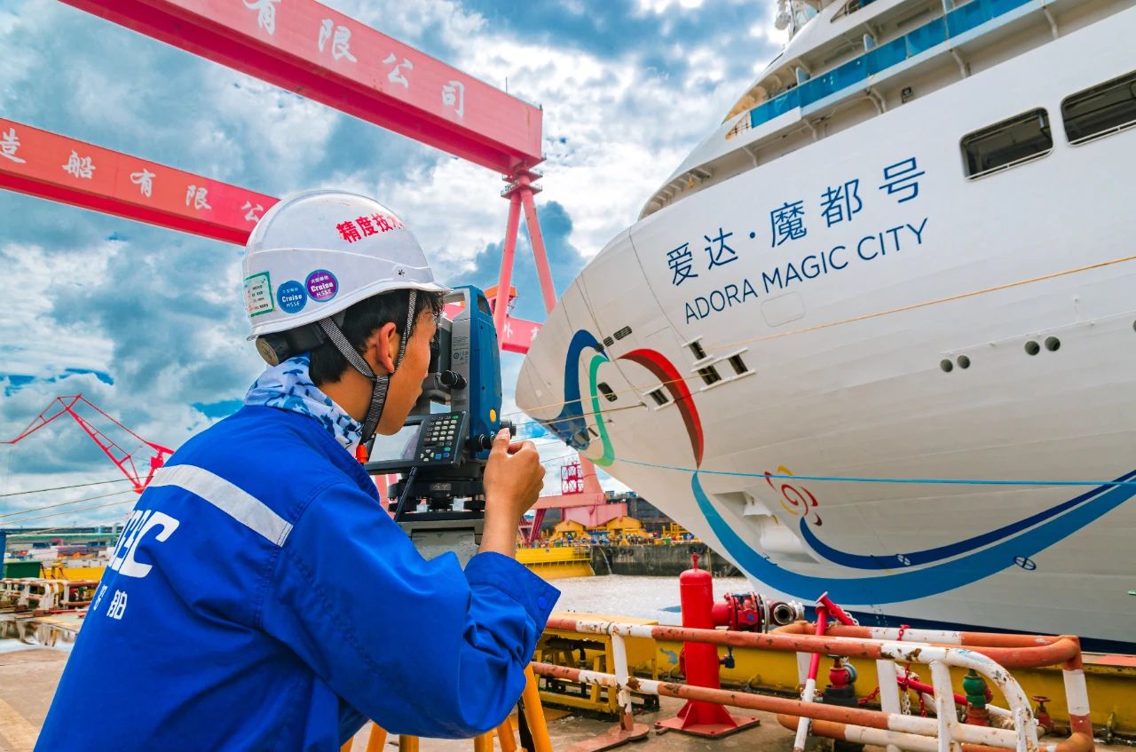 精度技術(shù)部的員工正在監(jiān)測(cè)國(guó)產(chǎn)首艘大型郵輪試航歸來(lái)時(shí)的精準(zhǔn)坐墩數(shù)據(jù)。