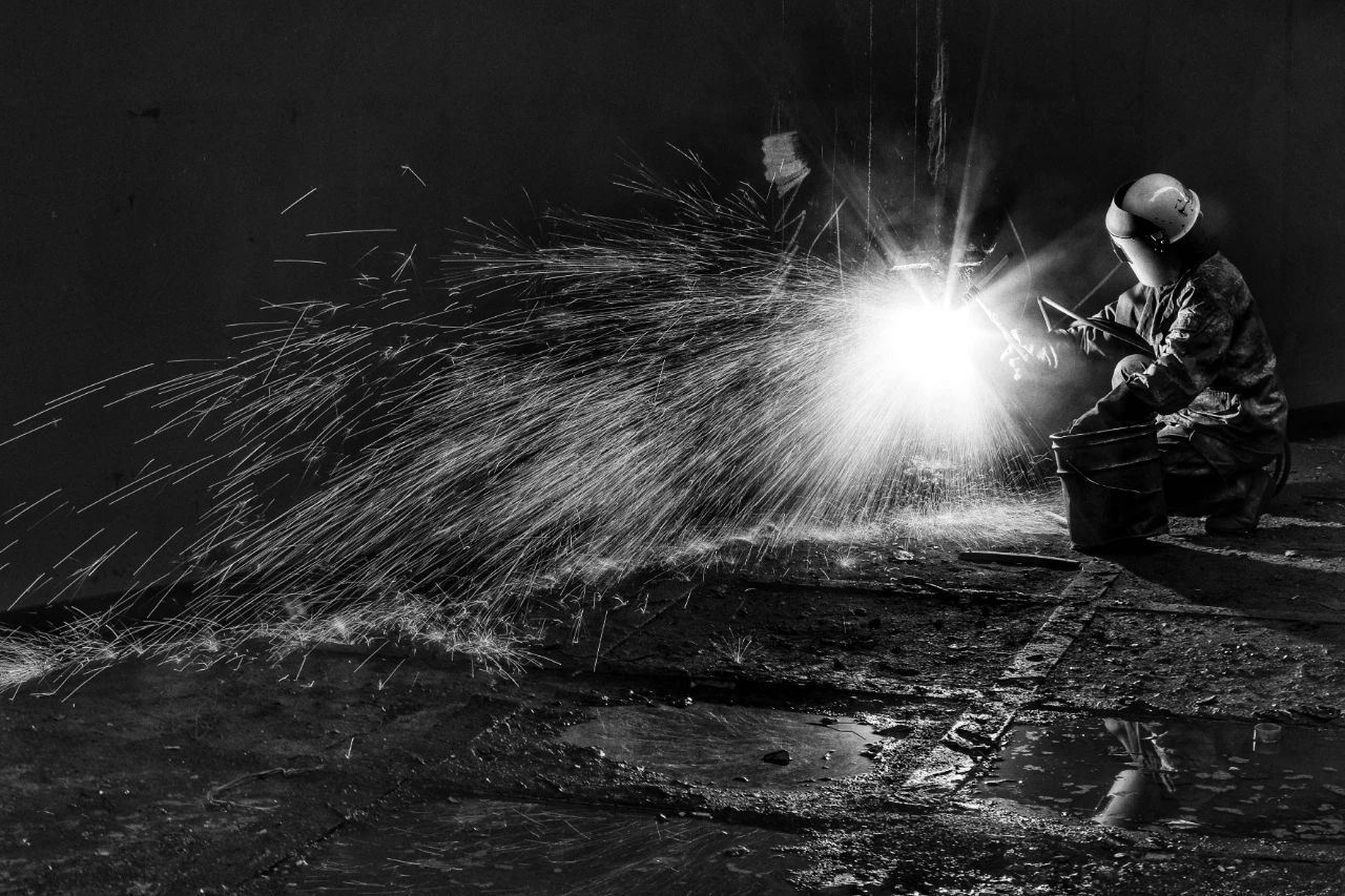 利用慢門記錄造船工人在氣刨時(shí)的工作場(chǎng)面。