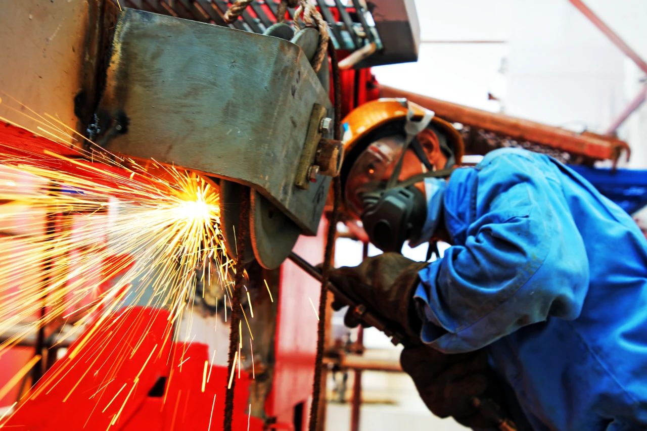 電焊工,就文沖修造最美的一線工人,他們從頭到腳“全副武裝”,一副墨鏡,一個(gè)面罩,一套包裹的嚴(yán)嚴(yán)實(shí)實(shí)的工作服是他們的色調(diào)。此起彼伏吱吱作響的燒焊聲,黃紅藍(lán)色的焊花,伴著刺眼的弧光,如噴泉一般是他們奏響的樂(lè)章。