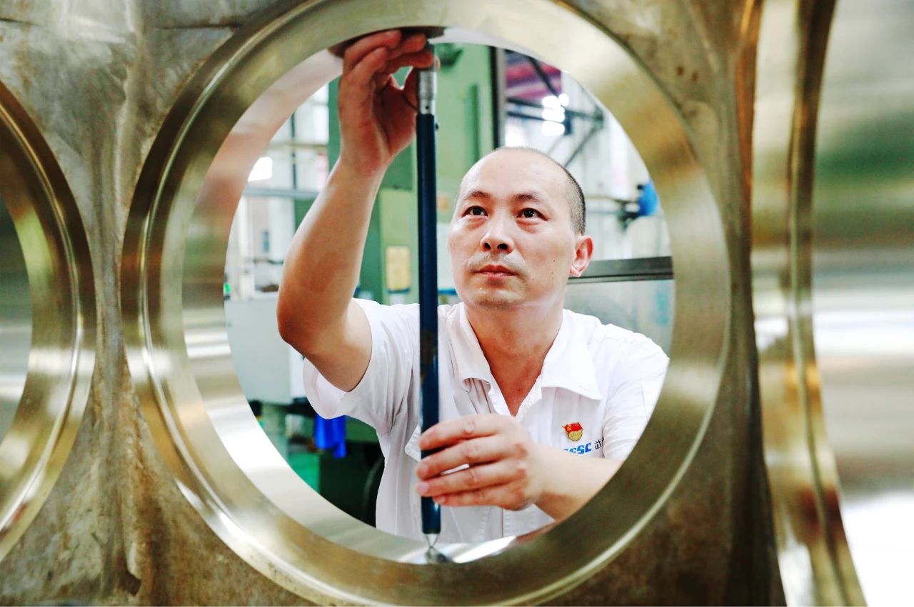 在武漢船機(jī)平臺(tái)生產(chǎn)現(xiàn)場(chǎng),一名機(jī)床操作師傅,正在對(duì)加工后的零件進(jìn)行檢測(cè),專注的表情展現(xiàn)了船舶人嚴(yán)把質(zhì)量關(guān),人品以誠(chéng)心為本,企品以恒心為要,產(chǎn)品以匠心為重的精神風(fēng)貌。