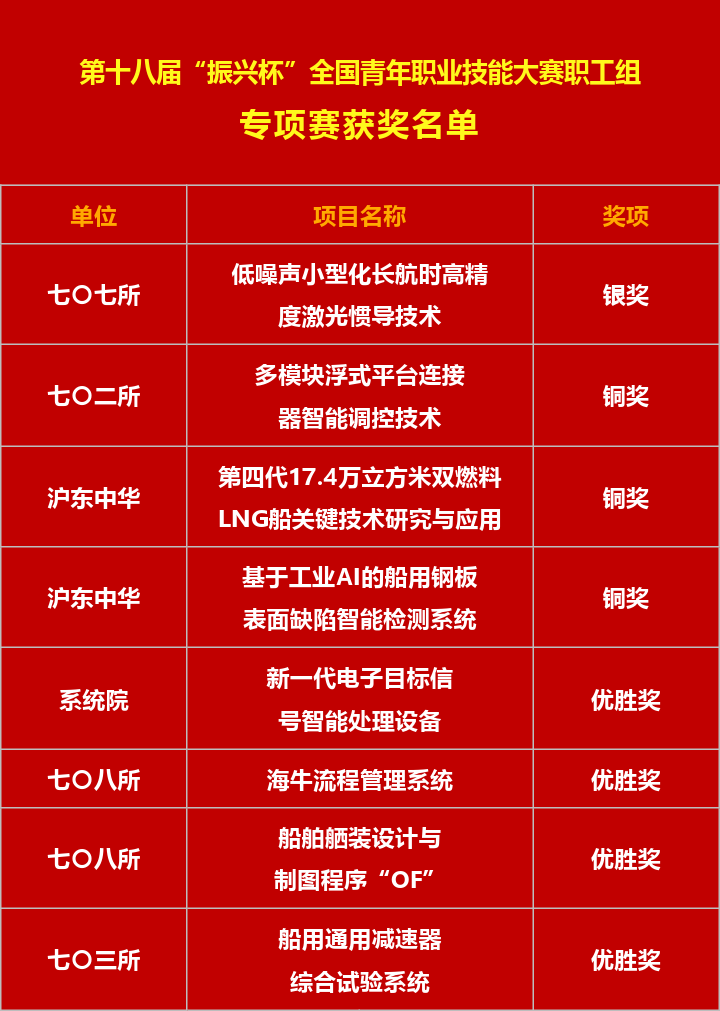 11月15日,第十八屆“振興杯”全國(guó)青年職業(yè)技能大賽職工組全國(guó)決賽在沈陽(yáng)落下帷幕,中國(guó)船舶集團(tuán)青年取得主體賽(職業(yè)技能競(jìng)賽)“1銀2銅7優(yōu)勝獎(jiǎng)”、專項(xiàng)賽(創(chuàng)新創(chuàng)效競(jìng)賽)“1銀3銅4優(yōu)勝獎(jiǎng)”的好成績(jī)。其中,黃埔文沖吳道升、七〇七所“低噪聲小型化長(zhǎng)航時(shí)高精度激光慣導(dǎo)技術(shù)”項(xiàng)目分獲銀獎(jiǎng),在“青春競(jìng)技場(chǎng)”上展現(xiàn)了船舶青年的自信卓越風(fēng)采。