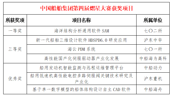 2025年1月3日,國務院國資委正式公布第四屆中央企業熠星創新創意大賽獲獎名單。中國船舶集團參賽項目榮獲一等獎1項、三等獎3項、優秀獎3項,優秀導師4名,集團公司榮獲“優秀組織單位”榮譽稱號。