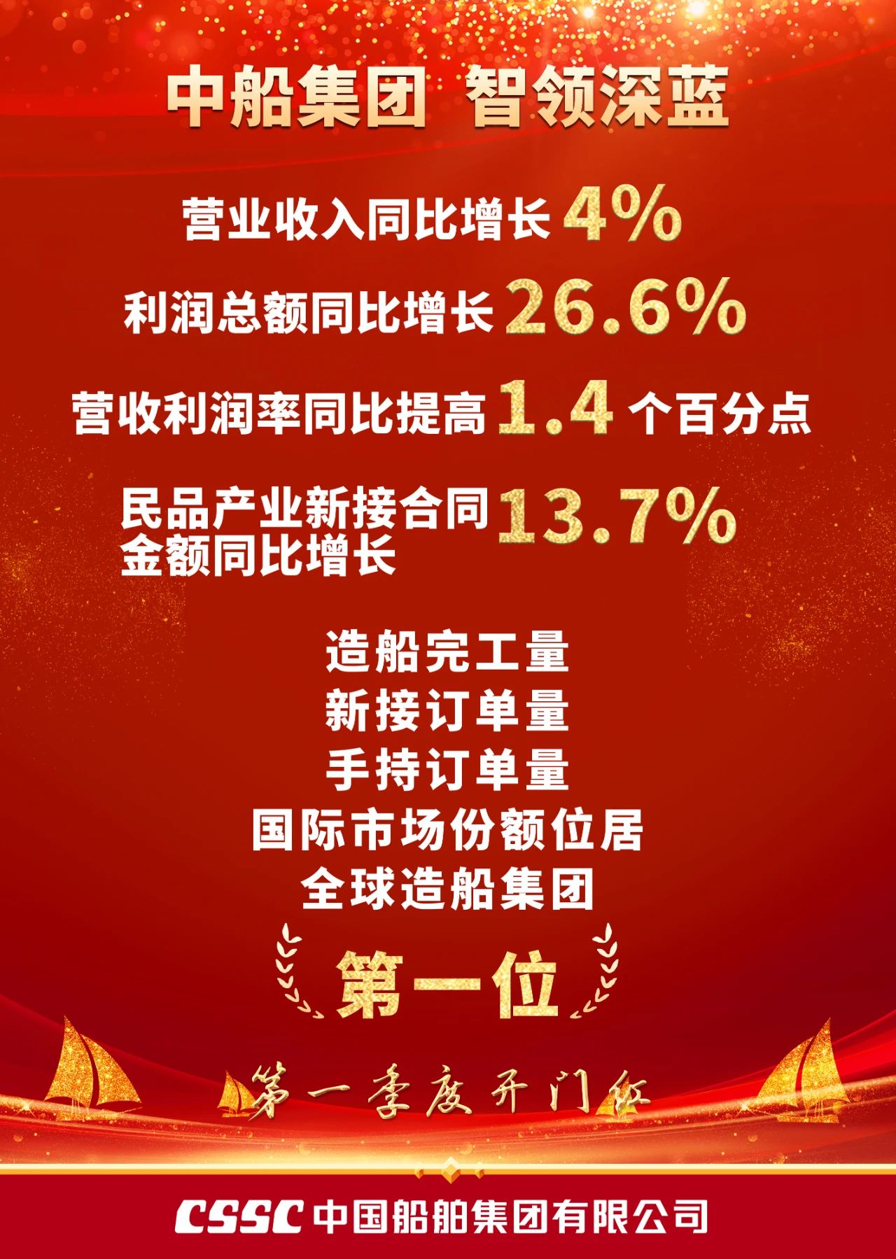 一季度,中船集團營業收入同比增長4%,利潤總額同比增長26.6%,營收利潤率同比提高1.4個百分點,民品產業新接合同金額同比增長13.7%,造船完工量、新接訂單量、手持訂單量國際市場份額位居全球造船集團第一位,收獲首季開門紅。