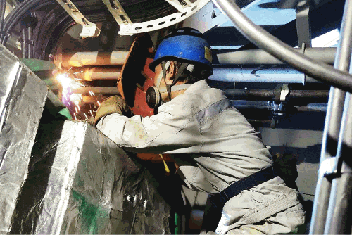 在狹小的空間里對(duì)錨機(jī)液壓管進(jìn)行焊接
