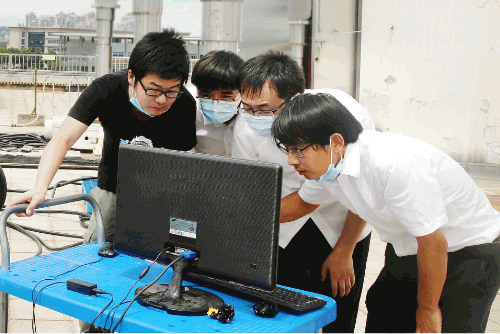 七一七所技術(shù)人員,在所內(nèi)試驗(yàn)樓頂頭頂烈日開展工作。