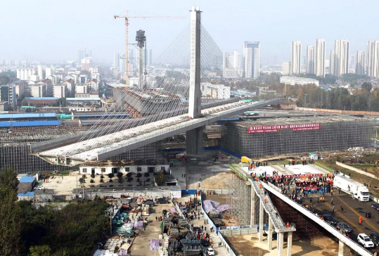 ▲2014年,完成姑嫂樹特大橋175000千牛亞洲之最的球鉸設計制造。武漢姑嫂樹立交橋在京廣線頭頂完成“空中轉體”,下方的京廣高鐵全程保持暢通。姑嫂樹立交橋國內首次在墩頂上進行大噸位混凝土箱梁轉體施工,單個轉體重量創下亞洲之最、世界第二。