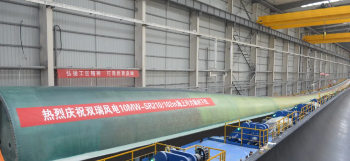 2月8日,在中國船舶集團七二五所雙瑞風電江蘇鹽城基地,國內第一支長度超過100米的風電葉片下線。這支由雙瑞風電自主研發的10MW-SR210型葉片,長度達102米,是目前世界上最長的10MW風電葉片。