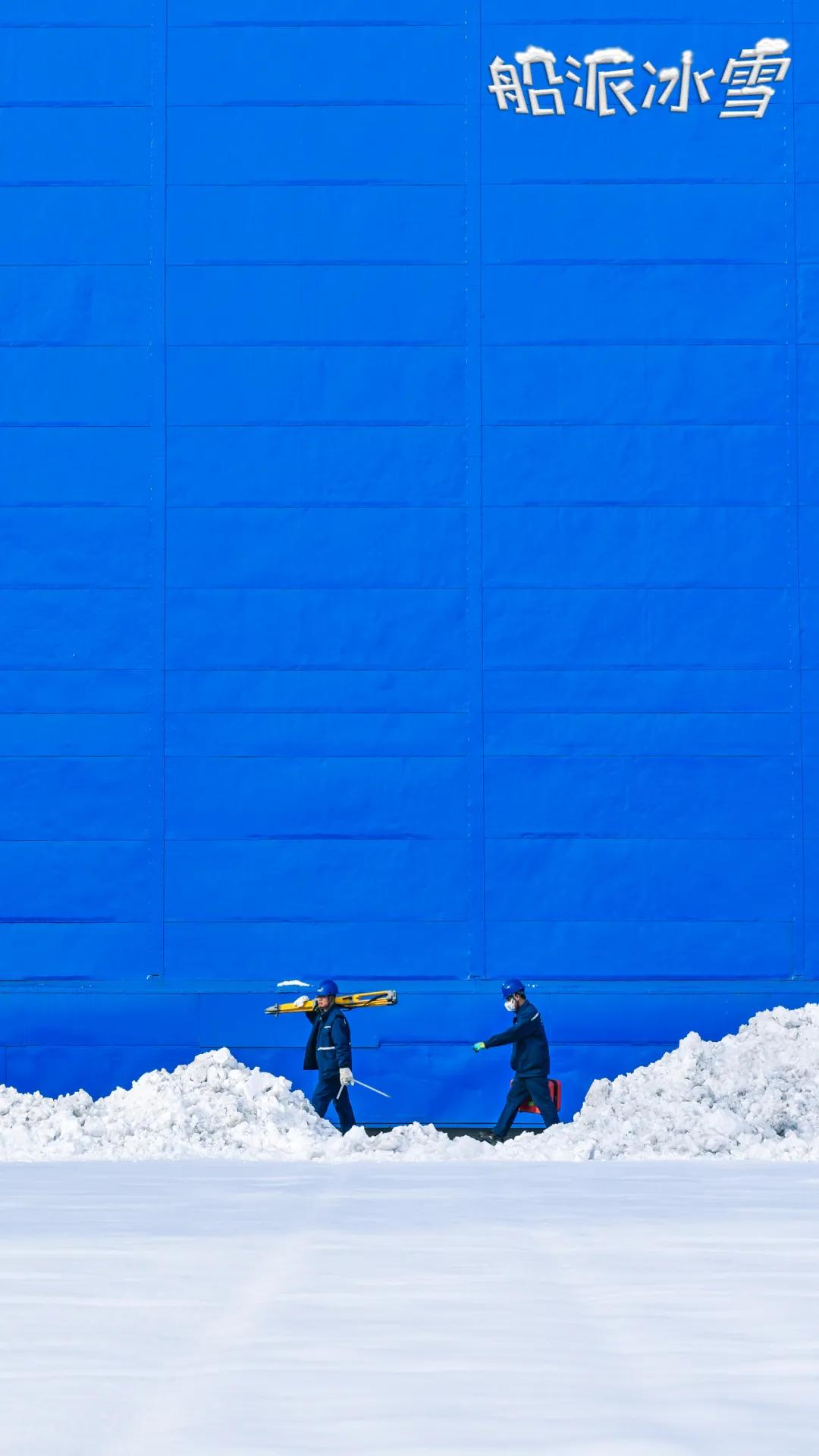 過膝的大雪掩埋了吊車的軌道,渤船小伙抄起“家伙”,為吊車開道,胳膊掄圓,雪花紛飛,別說這畫面還真有點浪漫了。