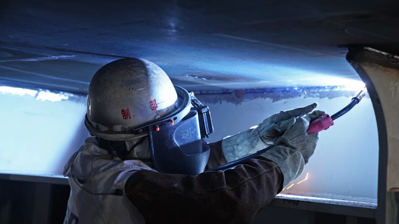 武漢船機——鋼構制造部員工穿著厚厚的防護服進行焊接工作。