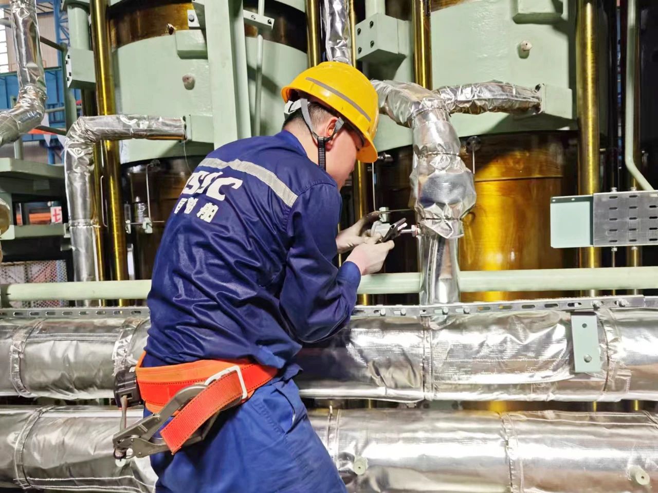 七二五所——雙瑞精鑄鈦板帶車間的師傅們正頂著酷暑進行修復裝配面工作。