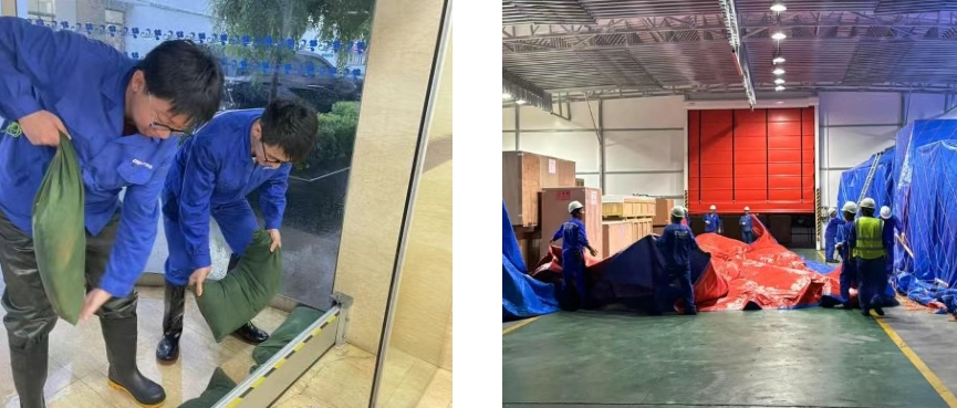 面對“竹節(jié)草”臺風的洶洶來襲,中船動力迅速組織下屬單位滬東重機、中船三井等開展全方位防汛防臺工作,筑牢安全屏障。中船三井集配倉庫應(yīng)急小組24小時值守,提前加固倉庫設(shè)施、轉(zhuǎn)移零件木箱,逐一加蓋雨布和網(wǎng)罩,形成“防雨+防風”的雙重保護體系。滬東重機青年突擊隊迅速集結(jié),針對地勢低洼的車間、辦公樓和物流通道,安裝了鋼制擋水板和防汛沙袋。