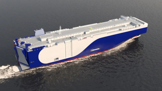 該船型由中國船舶集團旗下上海船院設計,總長200米,型寬38米,裝載能力9000車,可運輸電動車和常規燃料汽車以及其他類型的重型滾裝貨物。
