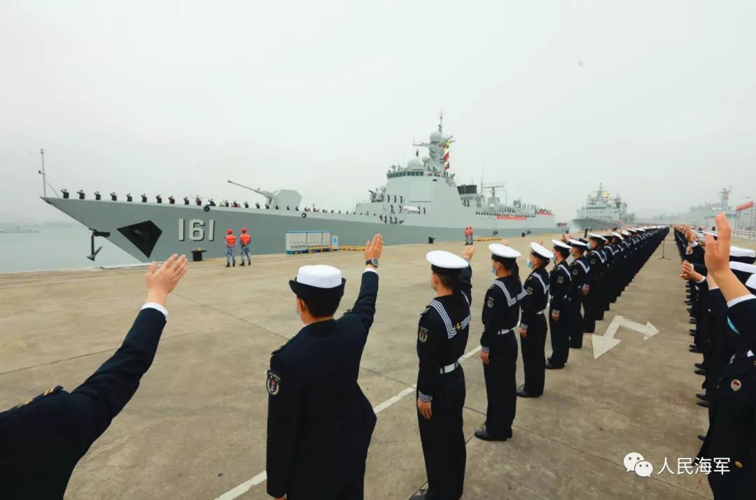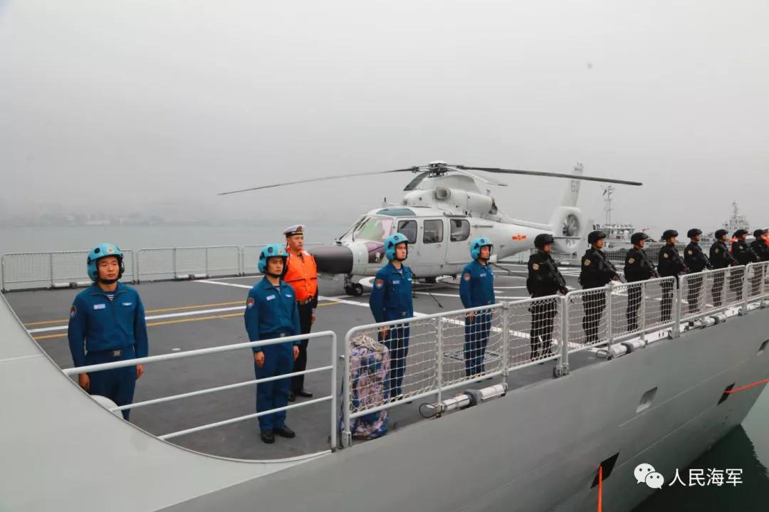 軍樂隊(duì)奏響《歡送進(jìn)行曲》,編隊(duì)艦艇依次解纜,緩緩駛離碼頭,任務(wù)官兵整齊列隊(duì)、士氣高昂,向祖國和人民揮手告別。