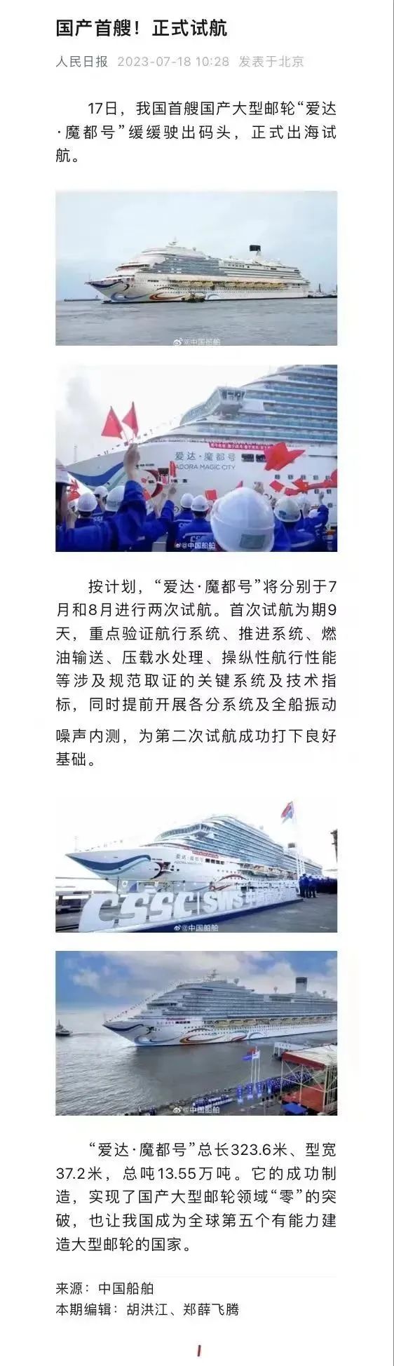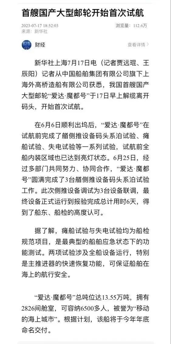媒體聚焦| 國產首制大型郵輪試航刷屏!