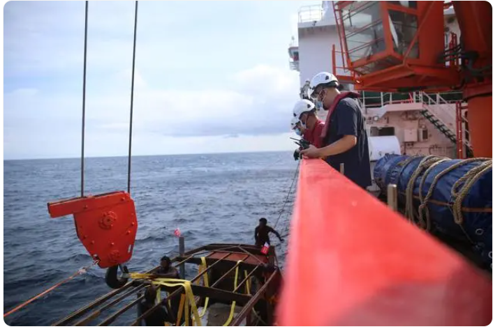 確定交接地點(diǎn)、制定求救人員登船保障方案、聯(lián)系當(dāng)?shù)睾J潞瓦厵z部門報(bào)備……一系列工作相繼完成,吊裝工作開始。