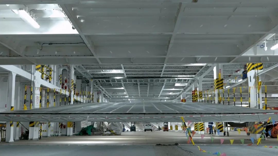 除了“薄”,船上承載車輛的甲板還有一個特點: 可根據汽車高度調整層高。 一艘船的滾裝設備和活動甲板多達100塊,船體搭載過程中任何一個環節出現偏差,都會導致活動甲板無法安裝。而廣船國際對船舶生產全過程實施嚴格的精度管理,目前已經完全攻克相關技術,真正實現了船舶工業體系的進階。