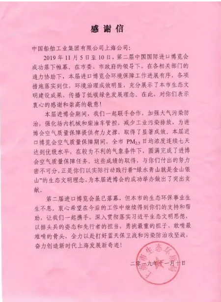 ????近日,中國船舶集團有限公司所屬中船上海船舶工業有限公司收到了一封來自上海市生態環境局的感謝信! 對中船上海地區企業在第二屆中國國際進口博覽會期間的環保管控和減排工作進行了充分肯定。